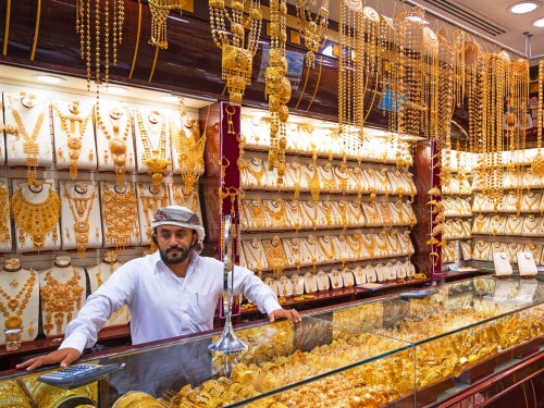 Chỉ mất khoảng hai phút đi bộ từ chợ gia vị là Qúy khách đã có mặt tại Chợ vàng Gold Souk nằm gọn trong con phố cổ Deira dài chừng 1km, với khoảng 500 gian hàng. Mỗi tiệm rộng vài chục mét vuông với 5-7 nhân viên. Nổi tiếng trên thế giới từ những năm 40, chợ vàng Gold Souk buôn bán số lượng vàng ước tính 10 tấn mỗi ngày. Khu chợ này chuyên bán vàng và các kim loại quý bao gồm kim cương, platinum, bạc và chính quyền quản lý nghiêm ngặt về chất lượng của tất cả các loại hàng hóa.