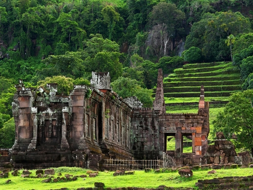 Xe đưa đoàn tham quan Wat Phou – Di sản văn hoá Thế giới với kiến trúc đền đài mang đậm phong cách Khmer được xây dựng từ thế kỷ VI.